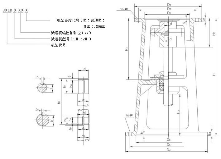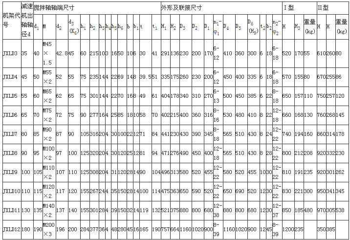 本機(jī)架系列的JXLD型適用于與XLD型擺線針輪行星減速機(jī)及CFL型行星齒輪減速機(jī)連接,JBLD型適用于與BLD型擺線減速機(jī)連接。為使攪拌軸與軸承室裝配、維修方便,本公司對軸承室結(jié)構(gòu)進(jìn)行改進(jìn)設(shè)計(jì),同時(shí)對與BLD2、BLD3、BLD4相配的機(jī)架JBLD2,JBLD3JBLD4的軸承室加大,使之與較粗的攪拌軸相一致。